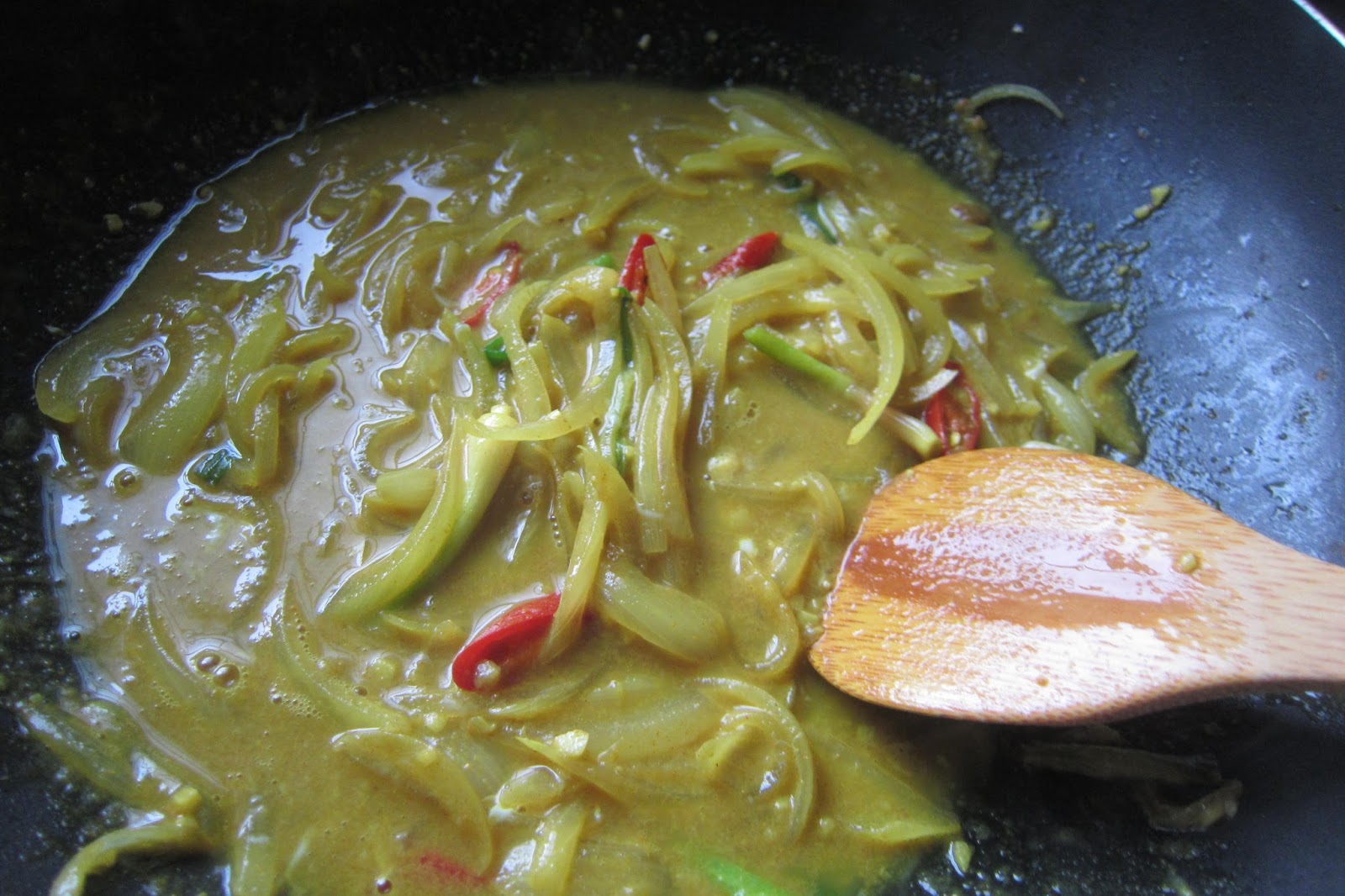 4. 燒熱鍋,下油、洋蔥絲炒香,再下蔥段、紅辣椒、蒜茸後,加入咖哩粉炒出香味,再加入白酒、魚露、清水2大湯匙,把洋蔥煨煮入味後,加糖、胡椒粉