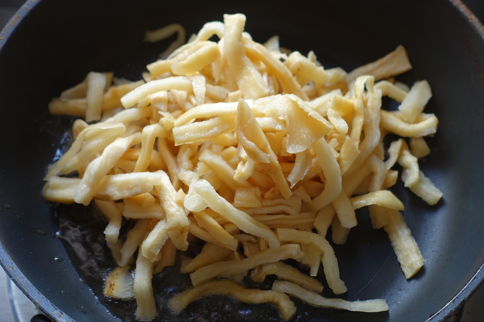 4. 燒熱鍋,下油、蒜片、蔥白段、桂皮、八角爆香,加入薯仔炒勻後加入水把蓋過薯仔煮至熟透後,下調味料煮勻,這時再放入凍豆腐煮至收汁即可上碟