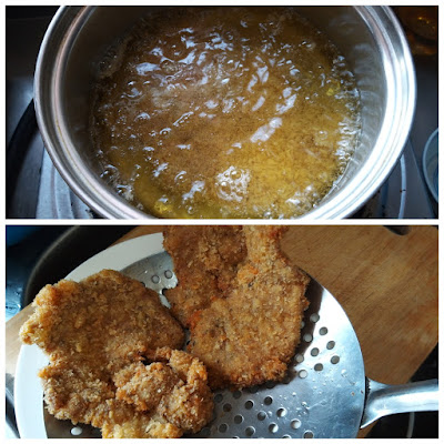 2. 把豬柳扖順序沾麵粉、全蛋液、麵包糠,再放入油鍋內用中火炸至全黃色取出,切件