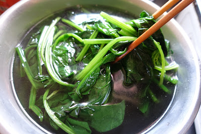 3. 燒熱1鍋水,加入薑片及油1湯匙,再加入菠菜汆燙至軟,隔水取出放入冷開水中降温後隔水取出