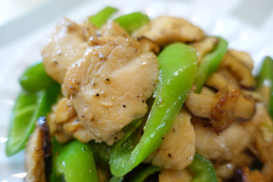 3. 熱鍋下油、蒜片,放入雞胸肉煎至兩面轉色有點焦焦,再下香菇炒軟,最後下青椒段,加入蠔油1湯匙兜勻即可上碟