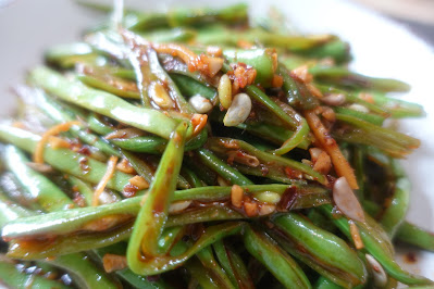 2. 燒熱鍋,下蒜蓉、薑絲爆後,加入四季豆炒約4分鐘(可以先用熱水把四季豆燙1分鐘),後,下火鍋底粉調味料兜勻即可