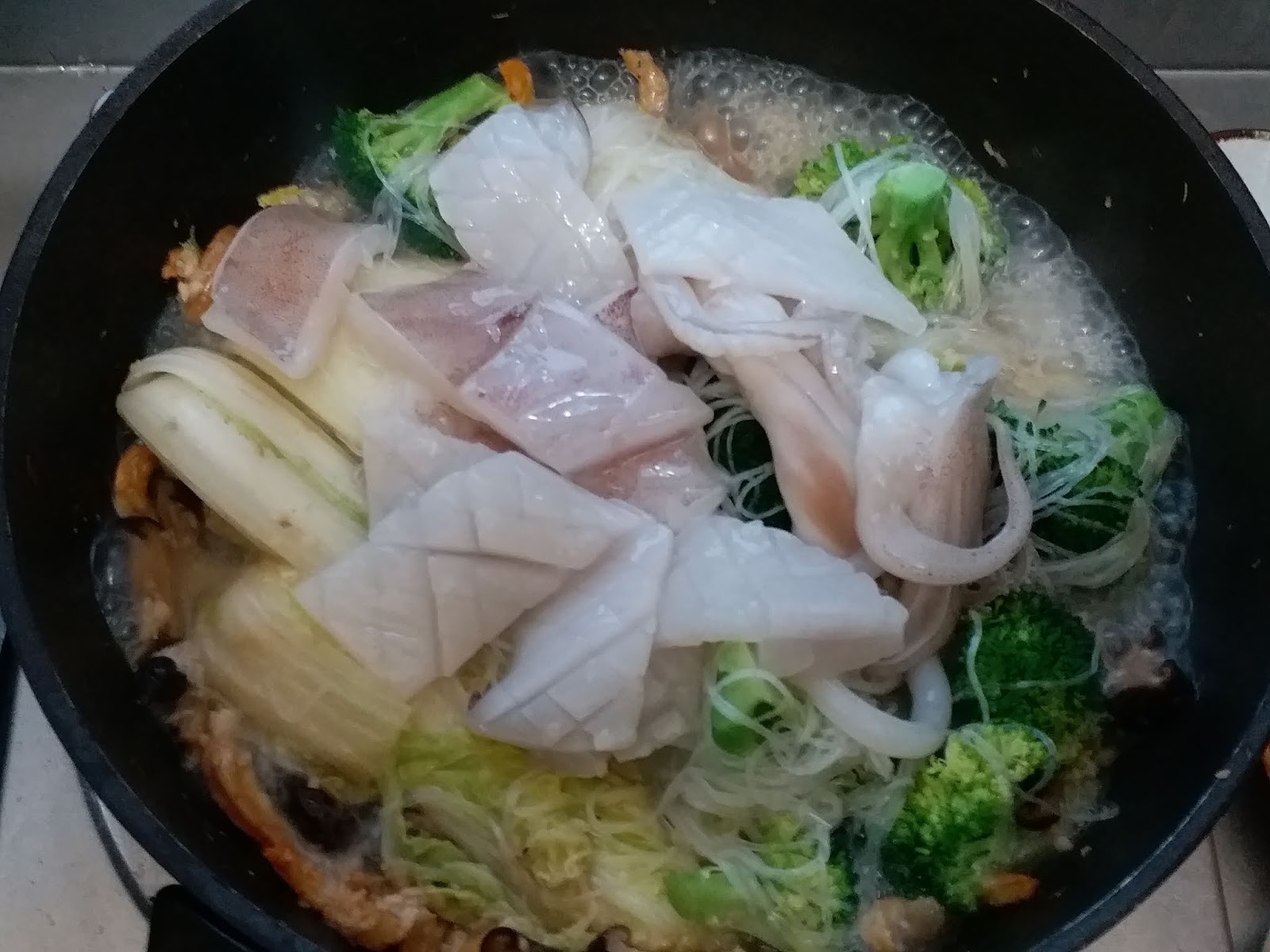 4. 鍋中加入1碗水煮至滾下少許胡椒粉、娃娃菜煮至軟,順序下西蘭花、粉絲、鮮魷拌勻轉入砂鍋中,蜆肉回鍋加蓋至滾起即可(蜆肉有咸味可以不加鹽,有需要可加生粉埋薄芡)